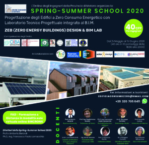 L’Ordine degli Ingegneri della Provincia di Matera ha organizzato (in modalità FAD), in collaborazione con la Zero Energy Buildings First Italian Network e con il patrocinio di altri Ordini incluso il nostro, la “Spring‐Summer School 2020 ‐ Progettazione degli Edifici a Zero Consumo Energetico con Laboratorio Tecnico Progettuale integrato al B.I.M.” dal 15 maggio al 15 giugno 2020 (40 ore in pomeriggi dalle 16.00 alle 20.00). La partecipazione a questo evento prevede, a cura dell’Ordine degli Ingegneri della Provincia di Matera, anche il rilascio di 40 CFP.