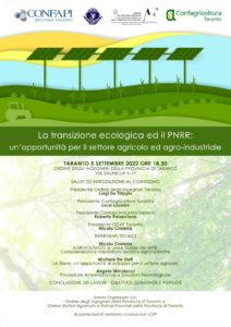 Un evento formativo e di approfondimento sul Pnrr e transizione ecologica, voluto da Confagricoltura, Confapi, Ordine degli Agronomi e dei Dottori Forestali e dei Dottori Agronomi  e Ordine degli Ingegneri della provincia di Taranto.